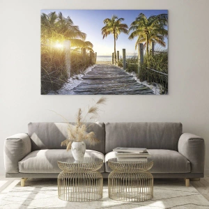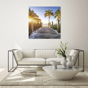 Impression sur verre - Image sur verre - Chemin en bois sur la plage entouré de palmiers - 70x50cm - Directement au paradis - Décoration murale moderne pour le salon et la chambre ARTTOR