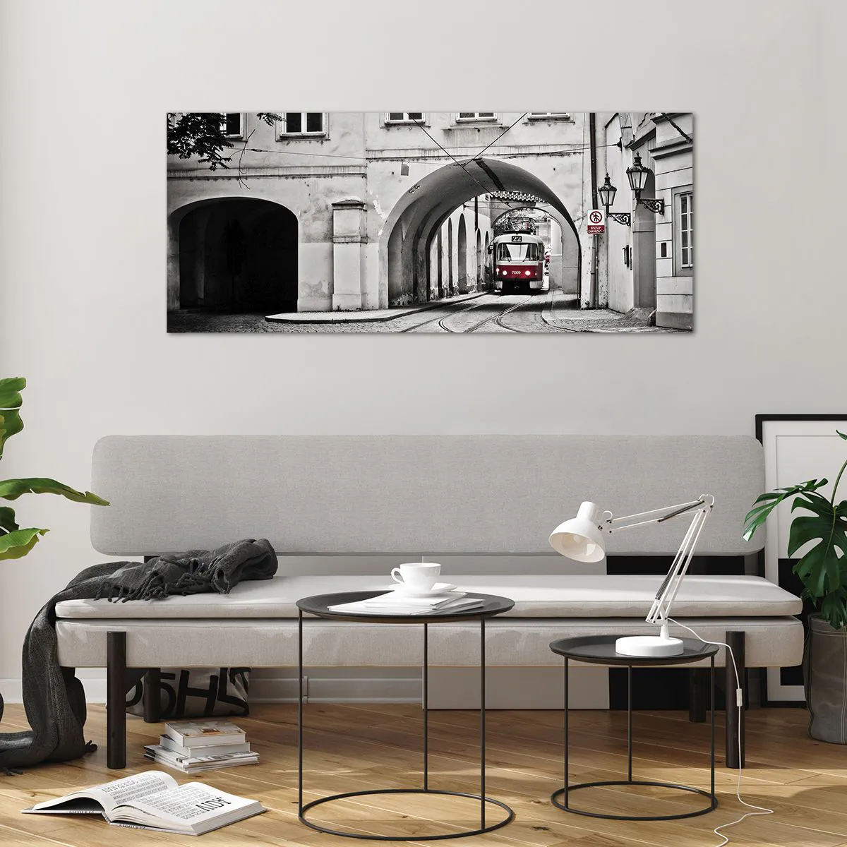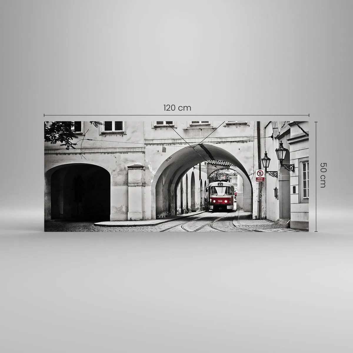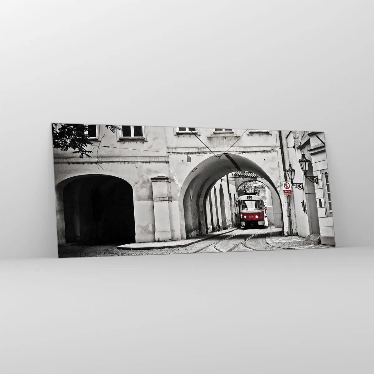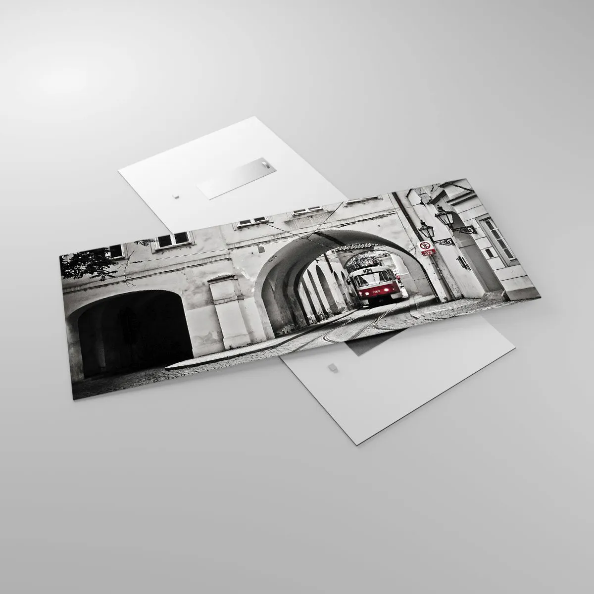 Impression sur verre - Image sur verre - Un tramway noir et blanc dans une rue historique de la ville - 120x50cm - Dans le labyrinthe de la ville - Décoration murale moderne pour le salon et la chambre ARTTOR