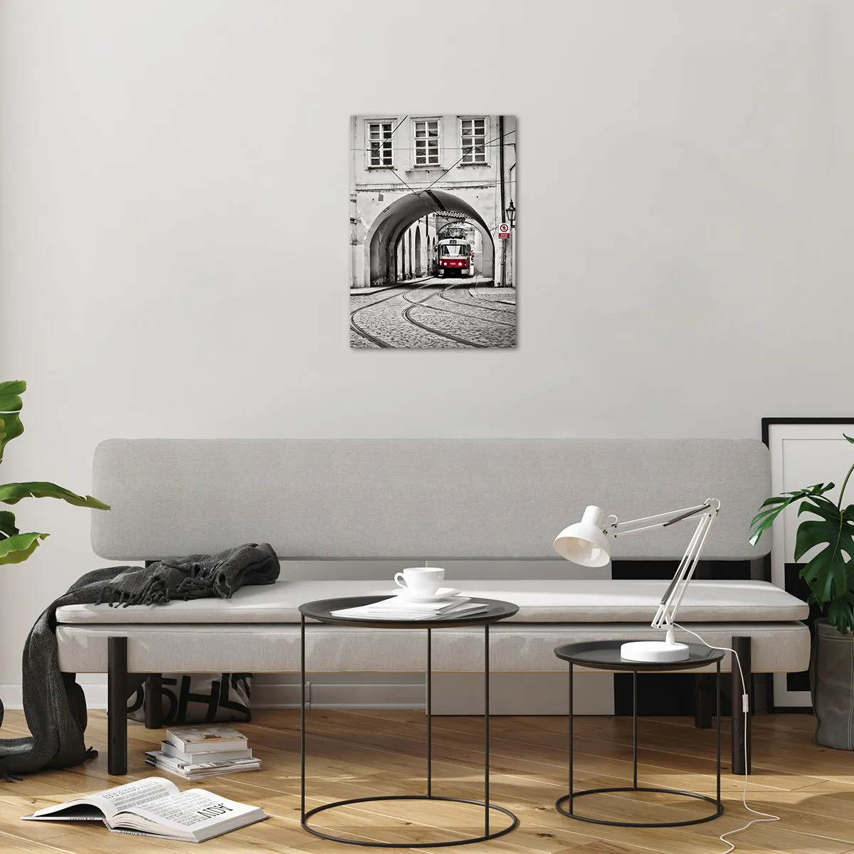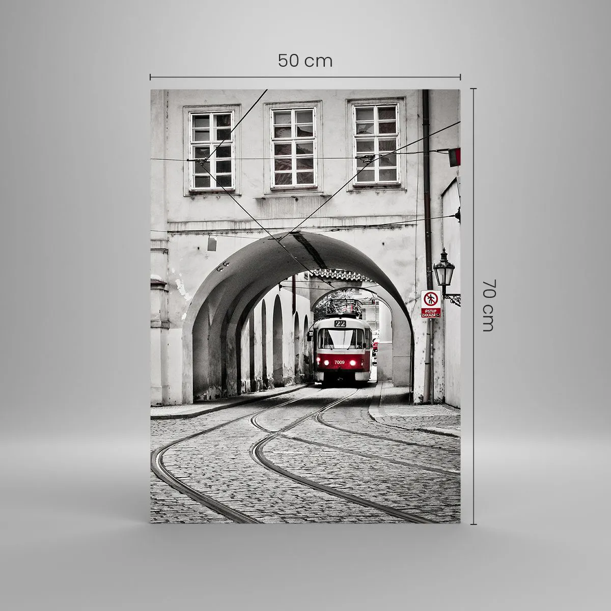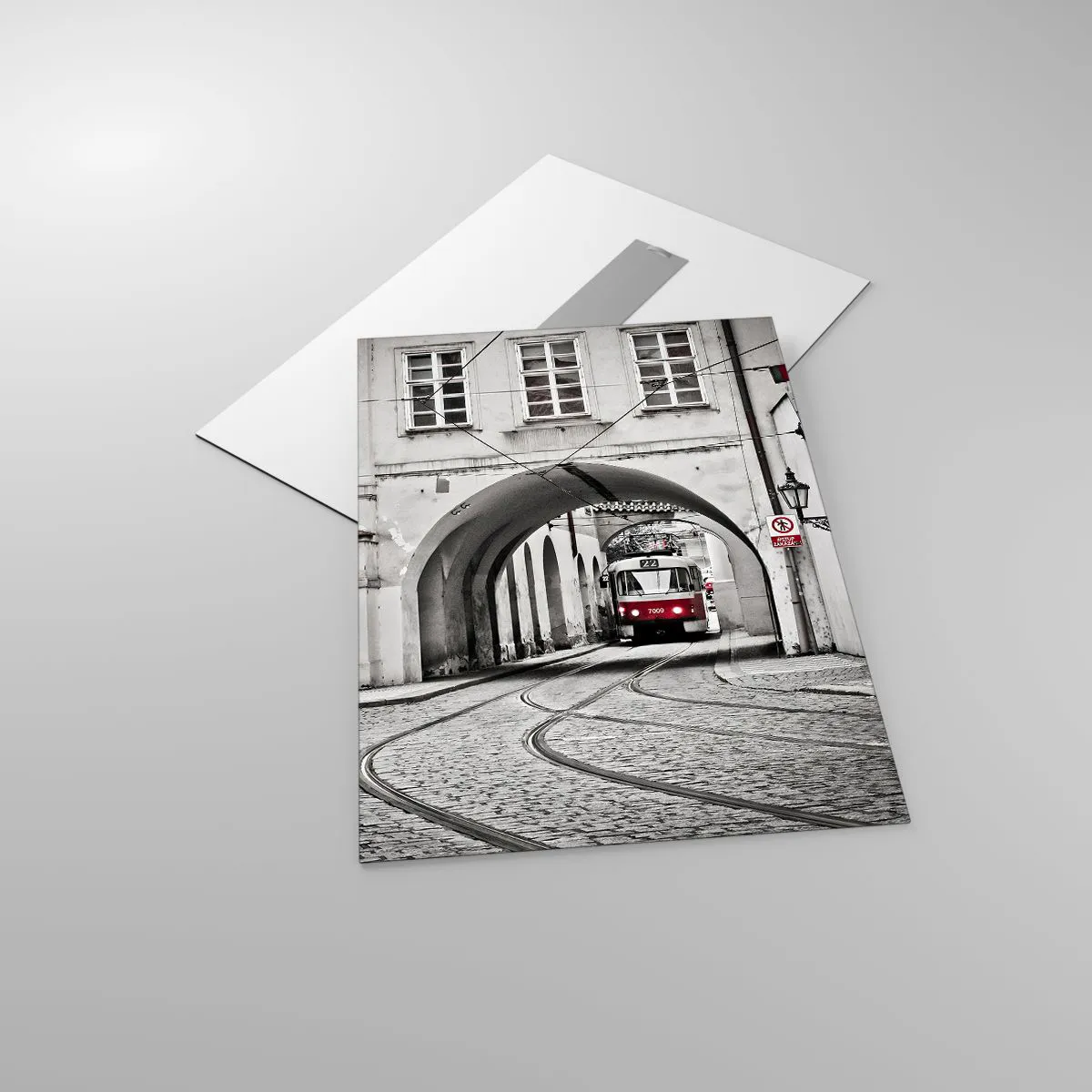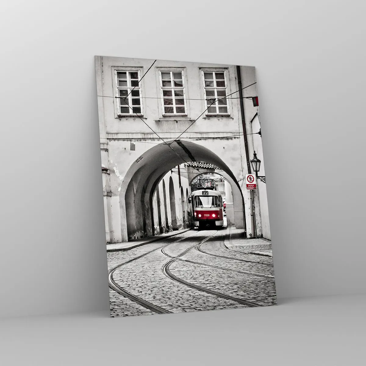 Impression sur verre - Image sur verre - Tramway noir et blanc dans une vieille rue - 50x70cm - Dans le labyrinthe de la ville - Décoration murale moderne pour le salon et la chambre ARTTOR