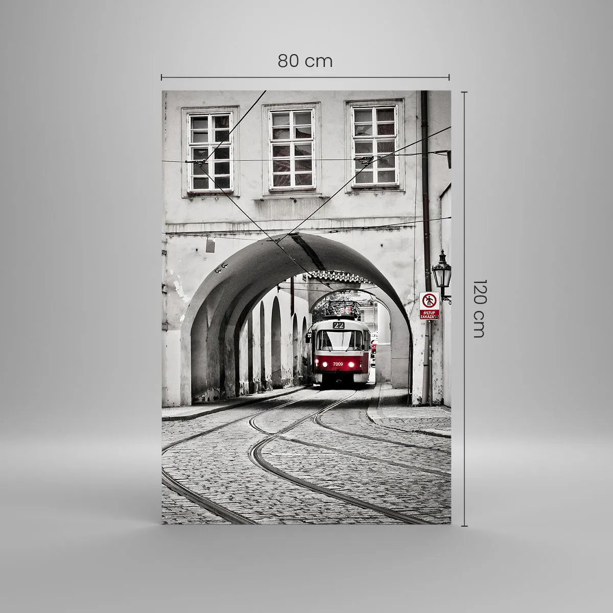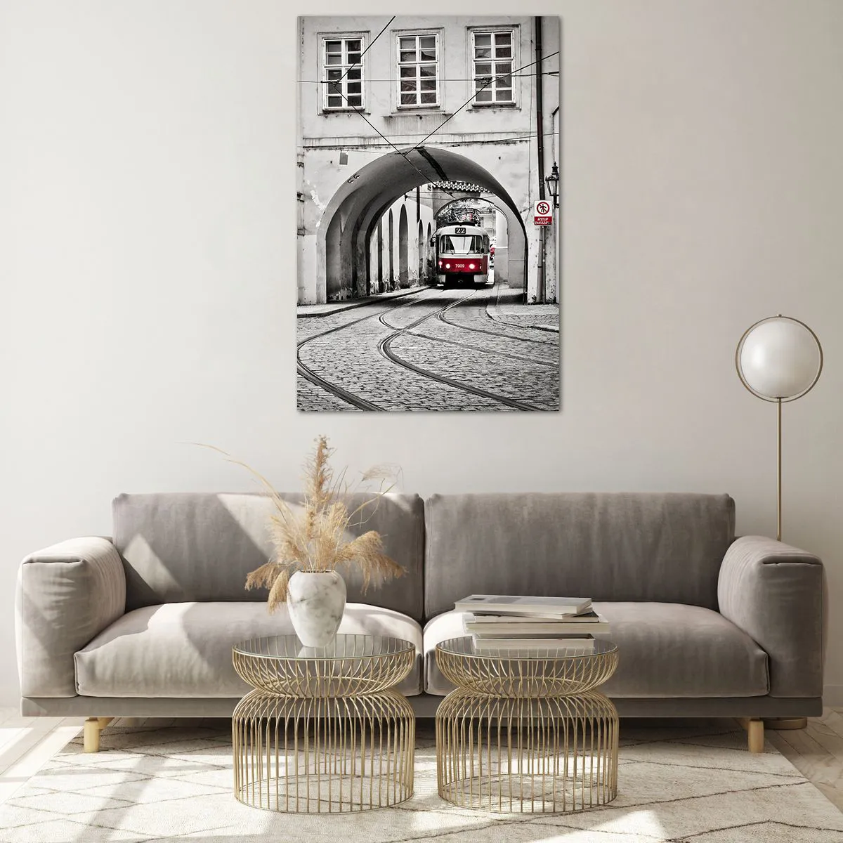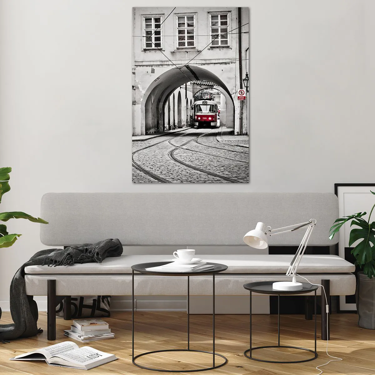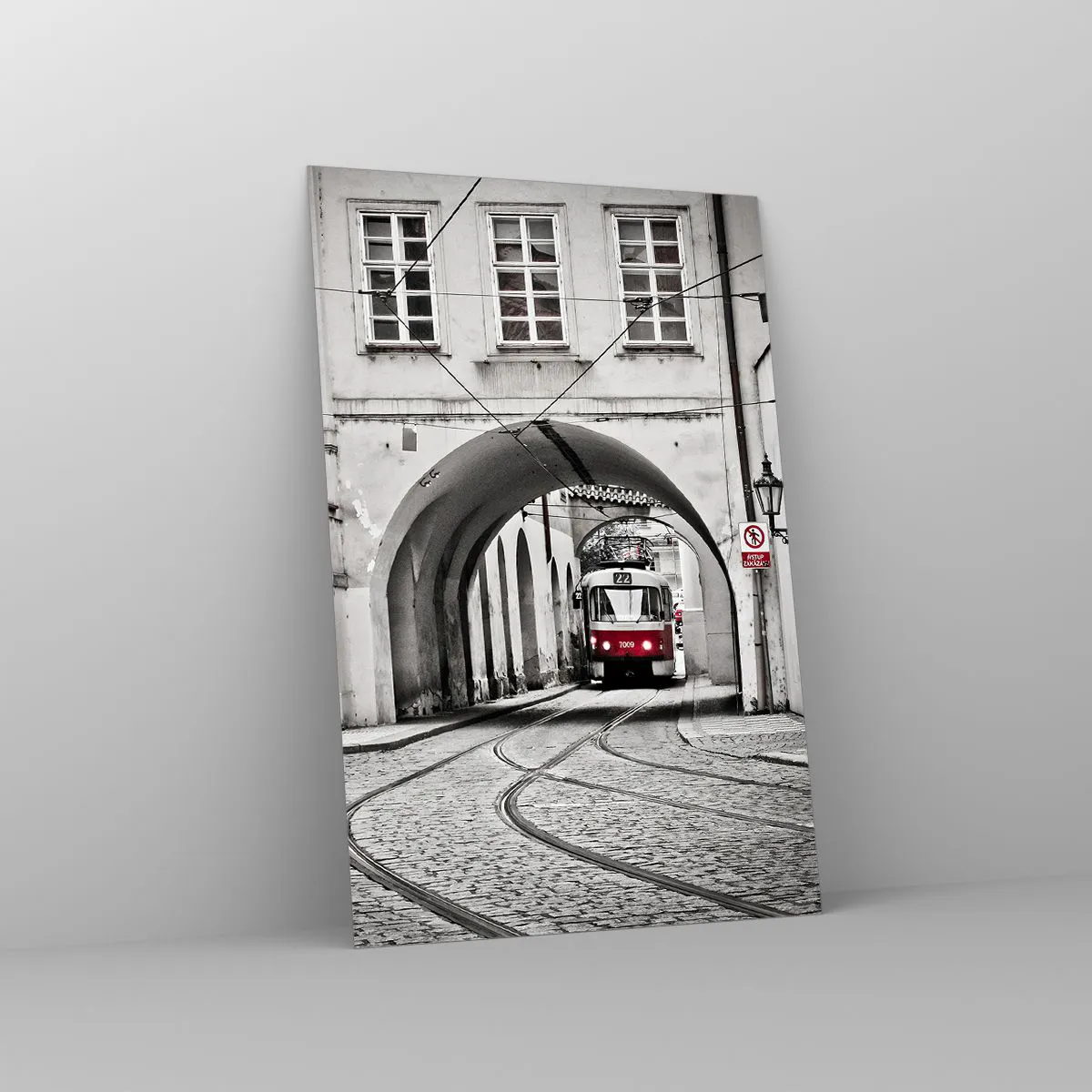 Impression sur verre - Image sur verre - Un tramway noir et blanc dans une rue historique de la ville - 80x120cm - Dans le labyrinthe de la ville - Décoration murale moderne pour le salon et la chambre ARTTOR