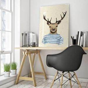 Impression sur verre - Image sur verre - Graphique d'un cerf en chemise de marin sur fond clair - 70x50cm - Parce que j'aime les chemises rayées - Décoration murale moderne pour le salon et la chambre ARTTOR