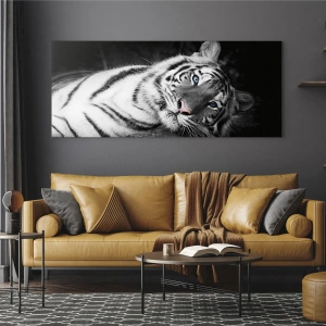 Impression sur verre - Image sur verre - Un tigre blanc aux yeux bleus dans un décor noir et blanc - 70x50cm - Sauvagerie et paix - Décoration murale moderne pour le salon et la chambre ARTTOR