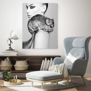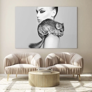Impression sur verre - Image sur verre - Femme stylisée avec un chinchilla dans une élégante composition en noir et blanc - 70x100cm - Dame au chinchilla - Décoration murale moderne pour le salon et la chambre ARTTOR