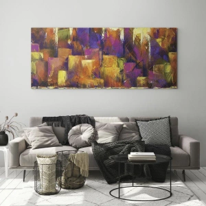 Impression sur verre - Image sur verre - Composition abstraite d'une métropole dans les tons jaune et violet - 160x50cm - Composition métropolitaine - Décoration murale moderne pour le salon et la chambre ARTTOR