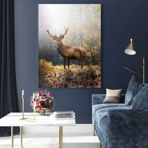 Impression sur verre - Image sur verre - Un cerf majestueux dans une forêt d'automne ensoleillée - 120x80cm - Toute sa majesté - Décoration murale moderne pour le salon et la chambre ARTTOR