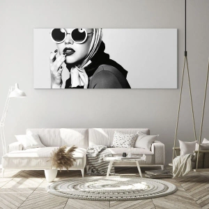 Impression sur verre - Image sur verre - Femme élégante avec des lunettes et un foulard noir et blanc - 70x50cm - Salutations des années 60 - Décoration murale moderne pour le salon et la chambre ARTTOR