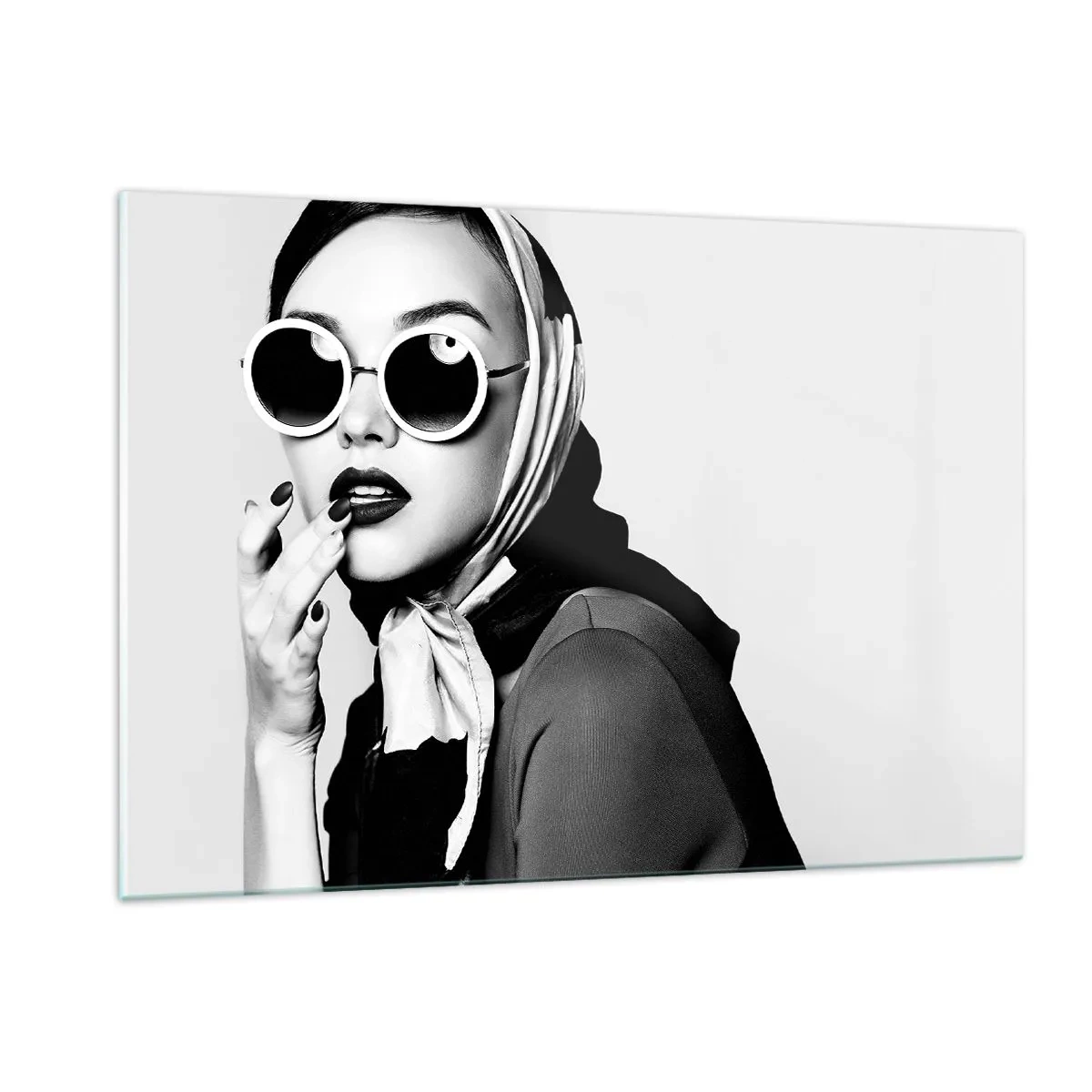 Impression sur verre - Image sur verre - Femme élégante avec des lunettes et un foulard noir et blanc - 120x80cm - Salutations des années 60 - Décoration murale moderne pour le salon et la chambre ARTTOR
