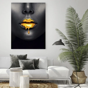 Impression sur verre - Image sur verre - Portrait noir et or d'une femme avec une goutte d'or sur les lèvres - 120x50cm - Bouche d'or - Décoration murale moderne pour le salon et la chambre ARTTOR