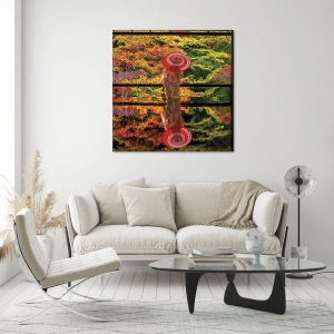 La peinture sur verre est faite sur un verre de 4 mm d'épaisseur. Les bords du verre ont une arête trapézoïdale mate. La tableau est sûr à l'utilisation et prêt à être accroché - il a des crochets en métal attachés à l'arrière du cadre et des entretoises en mousse permettant la régulation uniforme de la distance du tableau au mur.