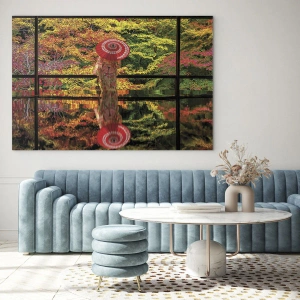 Impression sur verre - Image sur verre - Une femme en kimono avec un parapluie sur fond de paysage d'automne. - 120x50cm - Dans le temple de la nature - Décoration murale moderne pour le salon et la chambre ARTTOR
