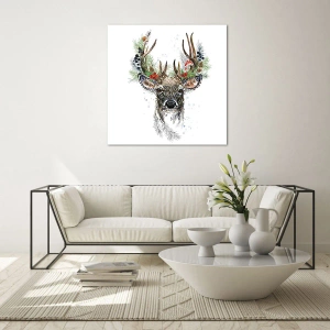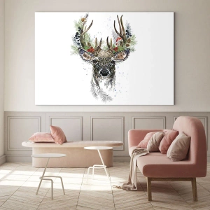 Impression sur verre - Image sur verre - Portrait d'un cerf avec des décorations de Noël, des branches et des baies - 100x70cm - En robe de fête - Décoration murale moderne pour le salon et la chambre ARTTOR