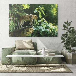 • Cette peinture sur verre représente un léopard majestueux perché sur un rocher dans une jungle tropicale. La végétation dense et la lumière naturelle soulignent la férocité et la force de ce prédateur, créant une décoration murale d'un réalisme remarqu...