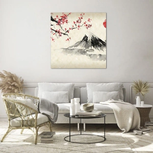 Impression sur verre - Image sur verre - Aquarelle japonaise représentant une montagne et une branche fleurie - 70x50cm - Tomber amoureux du Japon - Décoration murale moderne pour le salon et la chambre ARTTOR