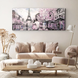 - Ce tableau romantique représente un couple se promenant dans Paris près de la Tour Eiffel, entouré d'arbres roses et de tons pastel. C'est la décoration idéale pour un intérieur romantique.