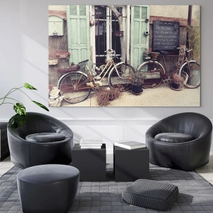Impression sur verre - Image sur verre - Vélos vintage devant une porte en bois aux volets pastel - 80x120cm - Que la province vive - Décoration murale moderne pour le salon et la chambre ARTTOR