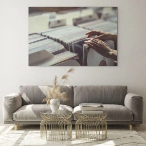 Impression sur verre - Image sur verre - Mains regardant à travers une collection de vinyles - 140x50cm - A la recherche d'émotions - Décoration murale moderne pour le salon et la chambre ARTTOR