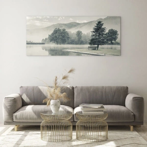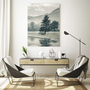 Le lac dort encore, et l'eau enveloppée de brouillard reflète le ciel et les arbres environnants. Le tableau représente une matinée calme au bord du lac, avec un banc au centre, ajoutant une sensation d'intimité et de silence à la scène. Les tons noir et blanc capturent parfaitement la paix de la nature et l'atmosphère mélancolique du petit matin. C'est une peinture harmonieuse qui apporte une atmosphère unique de tranquillité à votre intérieur.