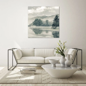 - Un lac calme au matin, avec un banc et du brouillard au-dessus de l'eau, en noir et blanc. La peinture sur verre idéale pour des intérieurs empreints de paix et de détente.