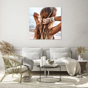 Impression sur verre - Image sur verre - Une femme aux cheveux longs sur la plage, entourée de coquillages et de sable. - 50x70cm - La soeur de l'eau et du soleil - Décoration murale moderne pour le salon et la chambre ARTTOR