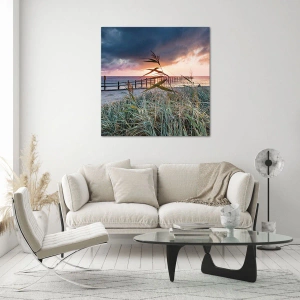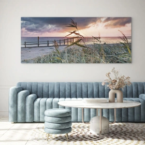 Impression sur verre - Image sur verre - La plage au coucher du soleil avec vue sur la jetée, entourée d'herbe - 120x80cm - Ça ne passe pas avec le vent - Décoration murale moderne pour le salon et la chambre ARTTOR