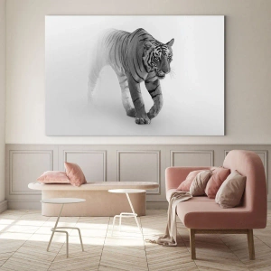 Impression sur verre - Image sur verre - Un tigre marchant dans la brume, avec un flou subtil en arrière-plan - 120x80cm - Accroupi dans le brouillard - Décoration murale moderne pour le salon et la chambre ARTTOR