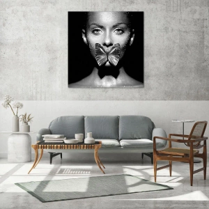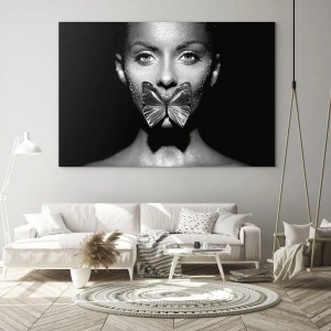 • Portrait en noir et blanc d'une femme, la bouche recouverte d'un papillon. L'image respire le mystère, l'élégance et la sensualité, créant un message symbolique puissant dans une forme minimaliste et moderne. Une décoration intérieure idéale.