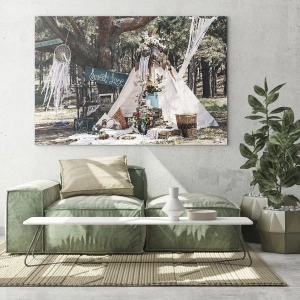 • Une charmante composition bohème dans un décor forestier, avec un tipi blanc, des fleurs et des objets artisanaux. Cette composition crée une atmosphère romantique et onirique qui apporte chaleur et inspiration à votre intérieur.