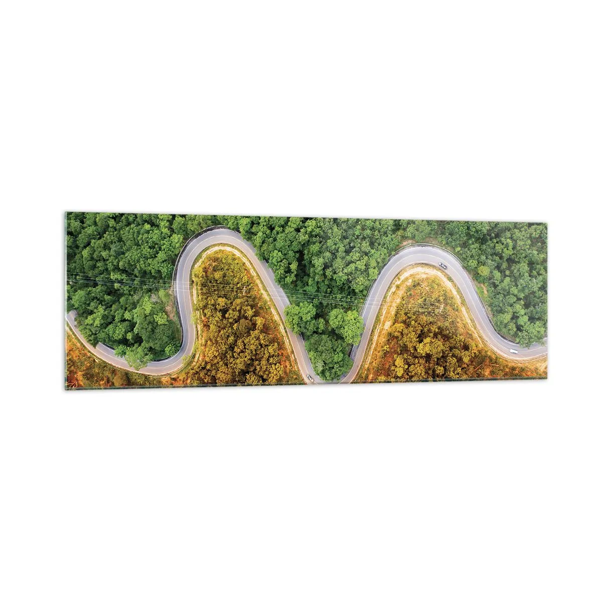 Impression sur verre - Image sur verre - Une route sinueuse à travers la forêt vue à vol d'oiseau - 160x50cm - Frontieres et differences - Décoration murale moderne pour le salon et la chambre ARTTOR