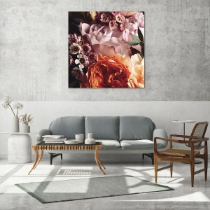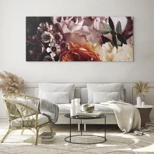 Impression sur verre - Image sur verre - Gros plan d'une composition de roses, d'œillets et de petites fleurs. - 100x70cm - Enveloppé de beauté - Décoration murale moderne pour le salon et la chambre ARTTOR