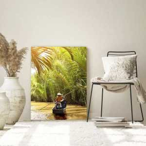 • Le tableau représente une scène fluviale tropicale, où un bateau transportant deux personnes navigue à travers une gorge dense de palmiers. La lumière du soleil filtrant à travers les feuilles confère à la composition une atmosphère chaleureuse et rela...