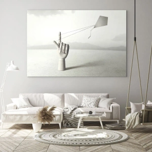 Impression sur verre - Image sur verre - Une main en bois tenant un cerf-volant flottant sur son doigt - 50x70cm - Épreuve de force - Décoration murale moderne pour le salon et la chambre ARTTOR