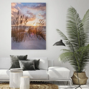 Impression sur verre - Image sur verre - Dunes avec des herbes sur fond de soleil couchant - 120x50cm - Salutations du soleil et du vent - Décoration murale moderne pour le salon et la chambre ARTTOR