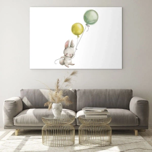 Impression sur verre - Image sur verre - Un lapin tenant deux ballons - 100x70cm - Moi aussi je vole! - Décoration murale moderne pour le salon et la chambre ARTTOR