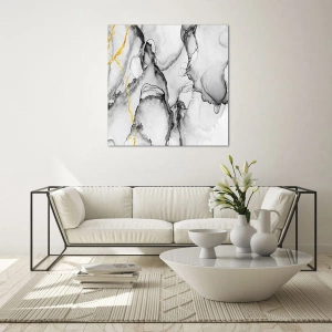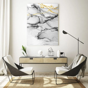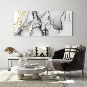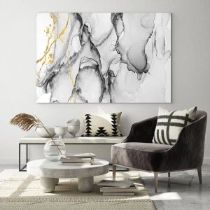 - Ce tableau présente une composition abstraite aux nuances de noir et de blanc, rehaussée de touches dorées dynamiques. Son design moderne et élégant attire le regard et ajoute une touche de luxe et d'élégance à votre intérieur.