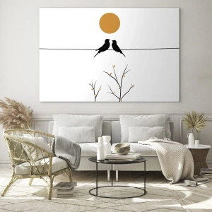 Impression sur verre - Image sur verre - Oiseaux sur une ligne avec un soleil jaune - 120x50cm - Soirée pour rossignols - Décoration murale moderne pour le salon et la chambre ARTTOR