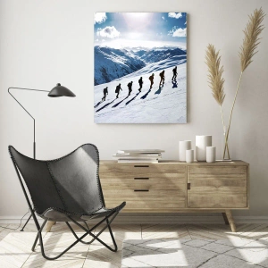 Ce tableau impressionne par la qualité de sa finition et la précision de ses détails. La pente enneigée, les traces de pas nettes et les personnages réalistes lui confèrent une atmosphère authentique. La composition du cadre oriente le regard vers l'horizon, où la chaîne de montagnes semble presque infinie. C'est la décoration idéale pour les intérieurs modernes et classiques, aussi bien pour les salons que pour les bureaux.