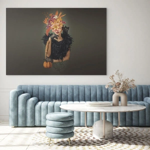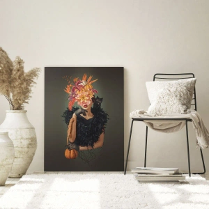 Impression sur verre - Image sur verre - Figure d'une femme en noir avec une citrouille, un chat et une composition florale - 50x70cm - Sort de sorcière - Décoration murale moderne pour le salon et la chambre ARTTOR