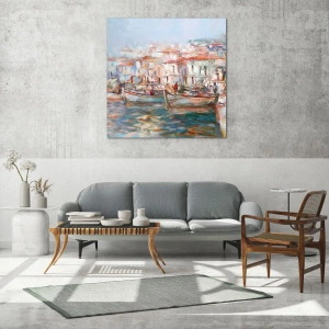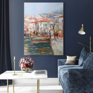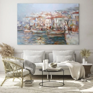 Impression sur verre - Image sur verre - Un port pittoresque avec des bateaux aux couleurs pastel - 50x70cm - Vacances pastelles - Décoration murale moderne pour le salon et la chambre ARTTOR