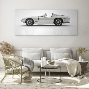 Impression sur verre - Image sur verre - Un cabriolet blanc classique sur un fond minimaliste avec des reflets. - 70x50cm - Promesse de plaisir - Décoration murale moderne pour le salon et la chambre ARTTOR