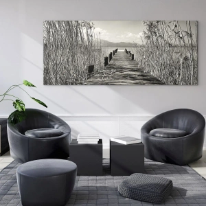 Impression sur verre - Image sur verre - Une jetée en bois parmi les hautes herbes au-dessus d'un lac aux tons sépia - 120x50cm - Dans le calme de l'herbe - Décoration murale moderne pour le salon et la chambre ARTTOR