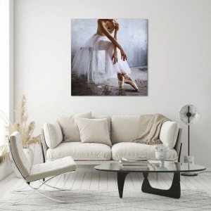 Impression sur verre - Image sur verre - Une ballerine en jupe de tulle se repose dans le hall - 120x80cm - Avant que les lumières de la rampe ne clignotent - Décoration murale moderne pour le salon et la chambre ARTTOR