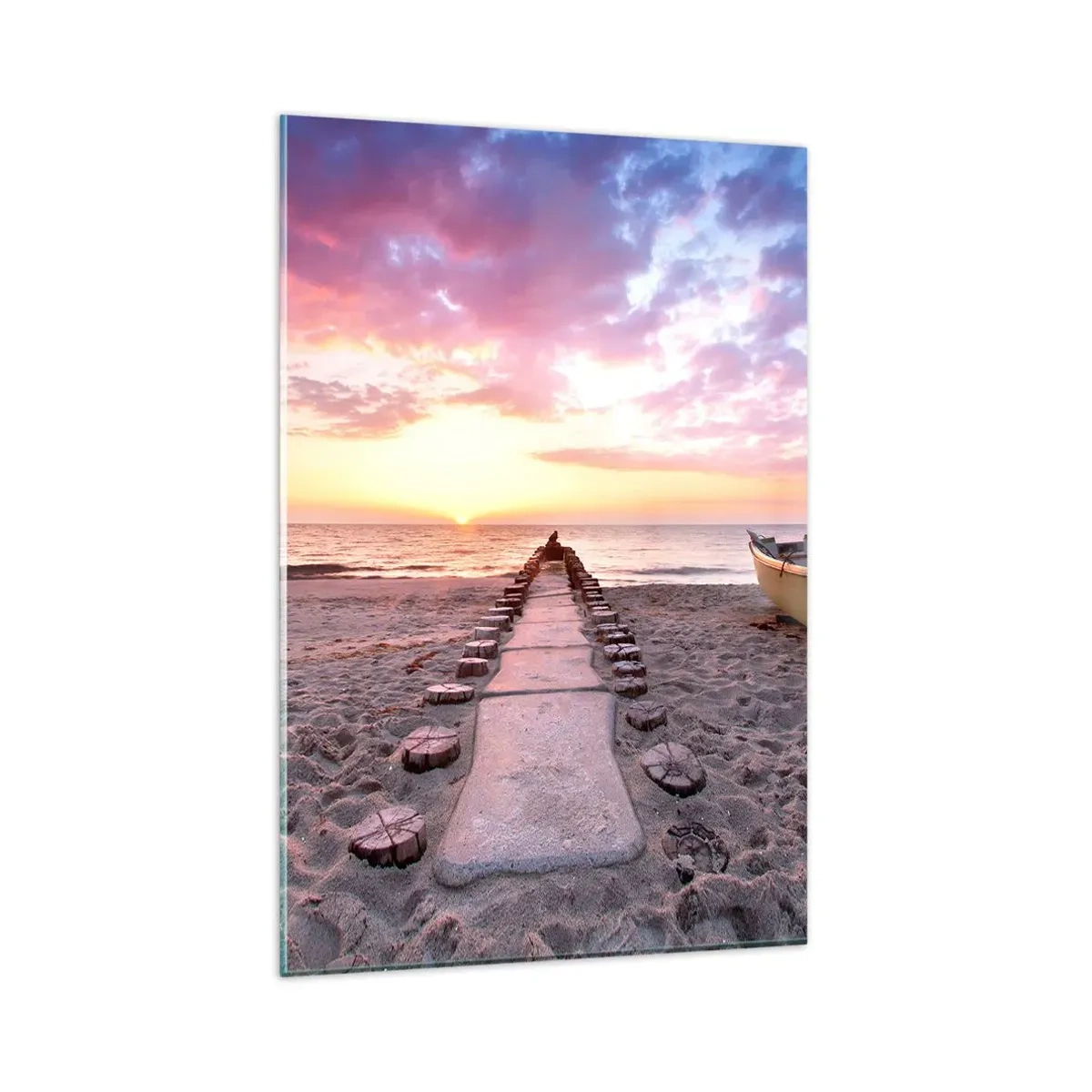Impression sur verre - Image sur verre - Plage au lever du soleil avec bateau et jetée - 80x120cm - Moment d'expérience profonde - Décoration murale moderne pour le salon et la chambre ARTTOR