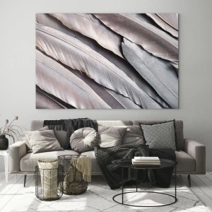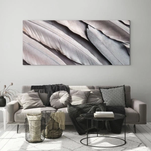 Impression sur verre - Image sur verre - Plumes délicates dans des tons subtils de gris et de beige - 140x50cm - En argent rose - Décoration murale moderne pour le salon et la chambre ARTTOR