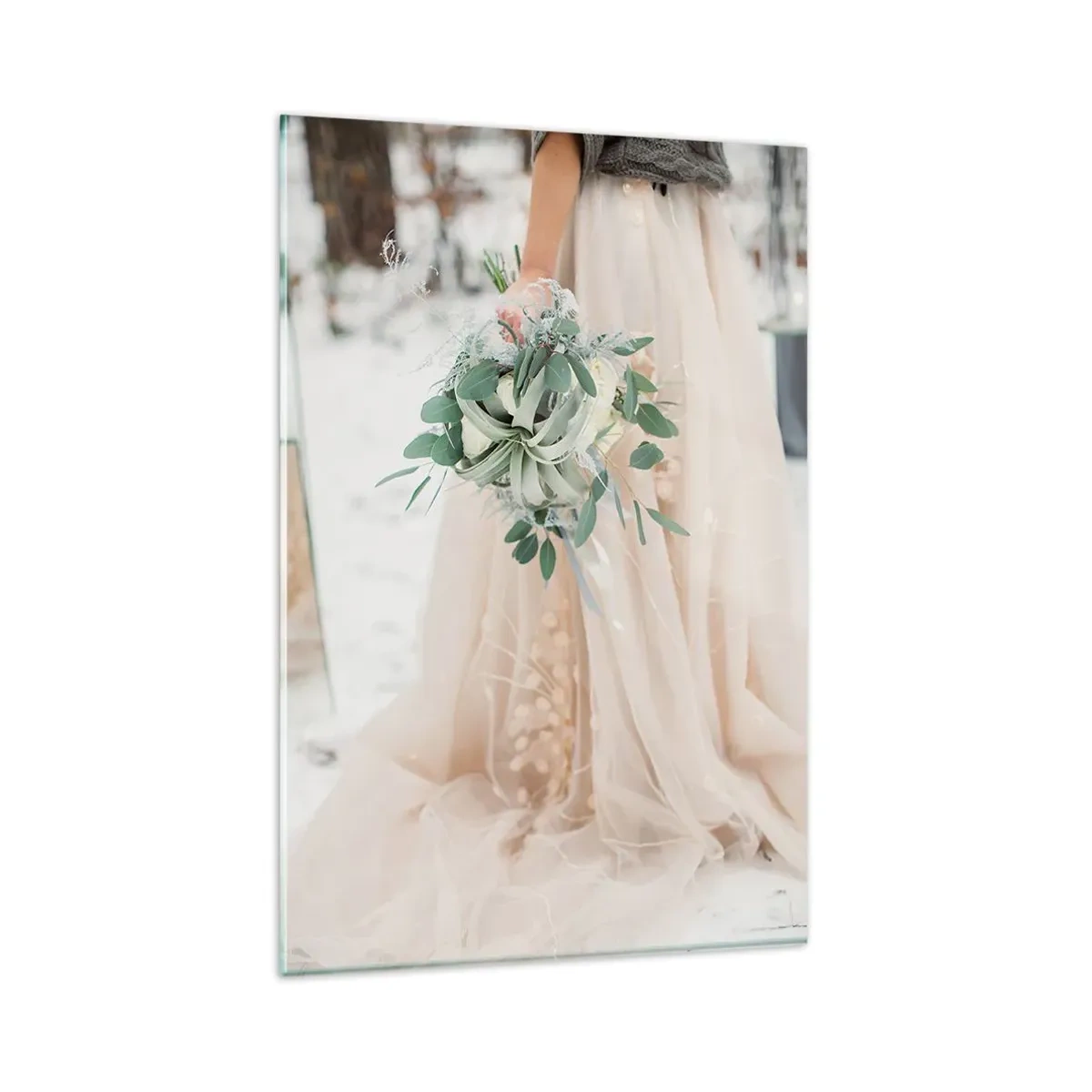 La peinture sur verre est faite sur un verre de 4 mm d'épaisseur. Les bords du verre ont une arête trapézoïdale mate. La tableau est sûr à l'utilisation et prêt à être accroché - il a des crochets en métal attachés à l'arrière du cadre et des entretoises en mousse permettant la régulation uniforme de la distance du tableau au mur.