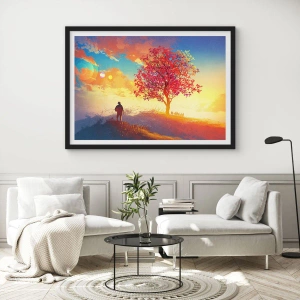 Affiche dans un cadre noir - Poster - Une silhouette sur une colline à côté d'un arbre coloré à la lumière du soleil couchant - 70x50cm - Pèlerin à destination - Décoration murale moderne pour le salon et la chambre ARTTOR