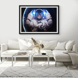 Affiche dans un cadre noir - Poster - Un chat dans une combinaison d'astronaute avec la Terre en arrière-plan et une lumière vive. - 70x50cm - Houston, vous avez un problème - Décoration murale moderne pour le salon et la chambre ARTTOR