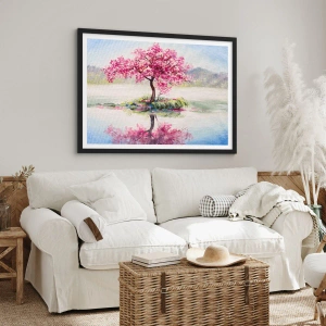 Affiche dans un cadre noir - Poster - Un arbre en fleurs sur une eau calme - 100x70cm - Fête du Printemps - Décoration murale moderne pour le salon et la chambre ARTTOR
