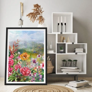 Affiche dans un cadre noir - Poster - Une composition colorée de fleurs sur un fond de paysage aux couleurs pastel - 70x50cm - Un jardin devenu fou - Décoration murale moderne pour le salon et la chambre ARTTOR