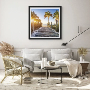 - Cette affiche représente un chemin en bois menant à une plage bordée de palmiers et illuminée par les rayons du soleil. Idéale pour les intérieurs à l'atmosphère tropicale et relaxante, elle est disponible avec un cadre noir.