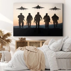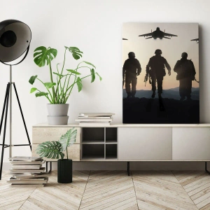 - Un tableau représentant les silhouettes de soldats et d'avions de chasse sur fond de coucher de soleil. Une composition pleine de force et de détermination, parfaite pour les intérieurs modernes et de style militaire.